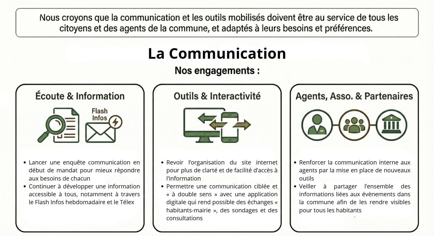 Nos valeurs se fondent sur 4 piliers : l’esprit village et la préservation du patrimoine ; le dialogue et la démocratie participative ; la préservation des espaces naturels et agricoles ; la cohésion sociale et l’éducation pour tous.