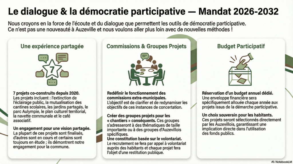 - Réservation d’un budget annuel dédié aux projets participatifs qui seront sélectionnés par les Auzevillois.