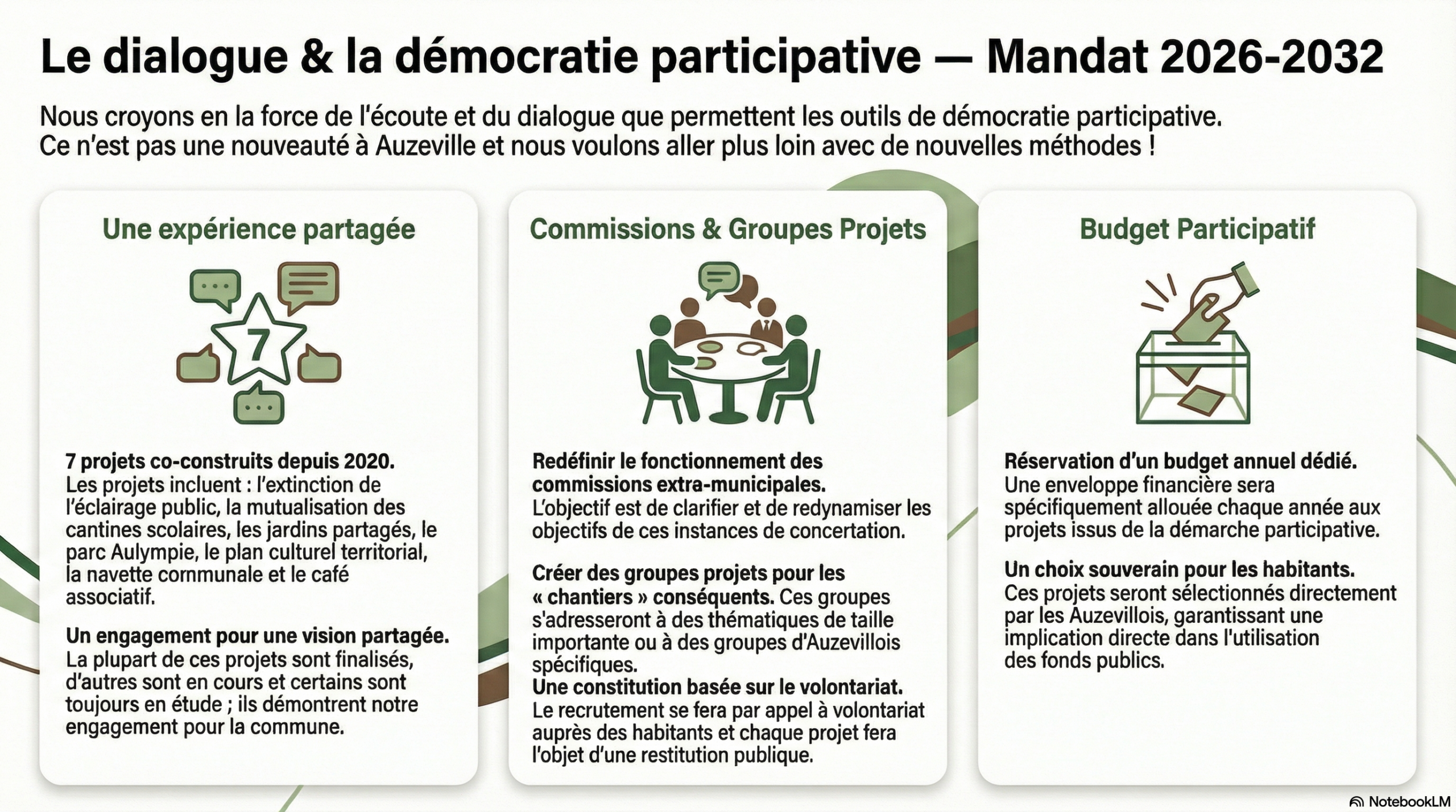 Nous croyons en la force de l’écoute et du dialogue que permet les outils de démocratie participative. Ce n’est pas une nouveauté à Auzeville et nous voulons aller plus loin avec de nouvelles méthodes !