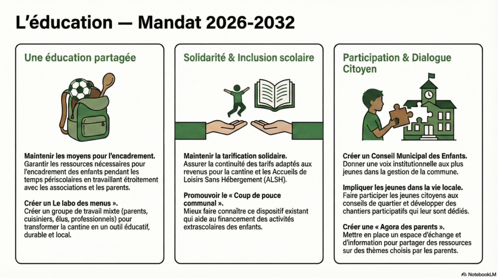 - Lancer « Le labo des menus », un groupe de travail associant parents, cuisiniers, élus et professionnels, pour faire de la cantine un outil éducatif, durable et local.