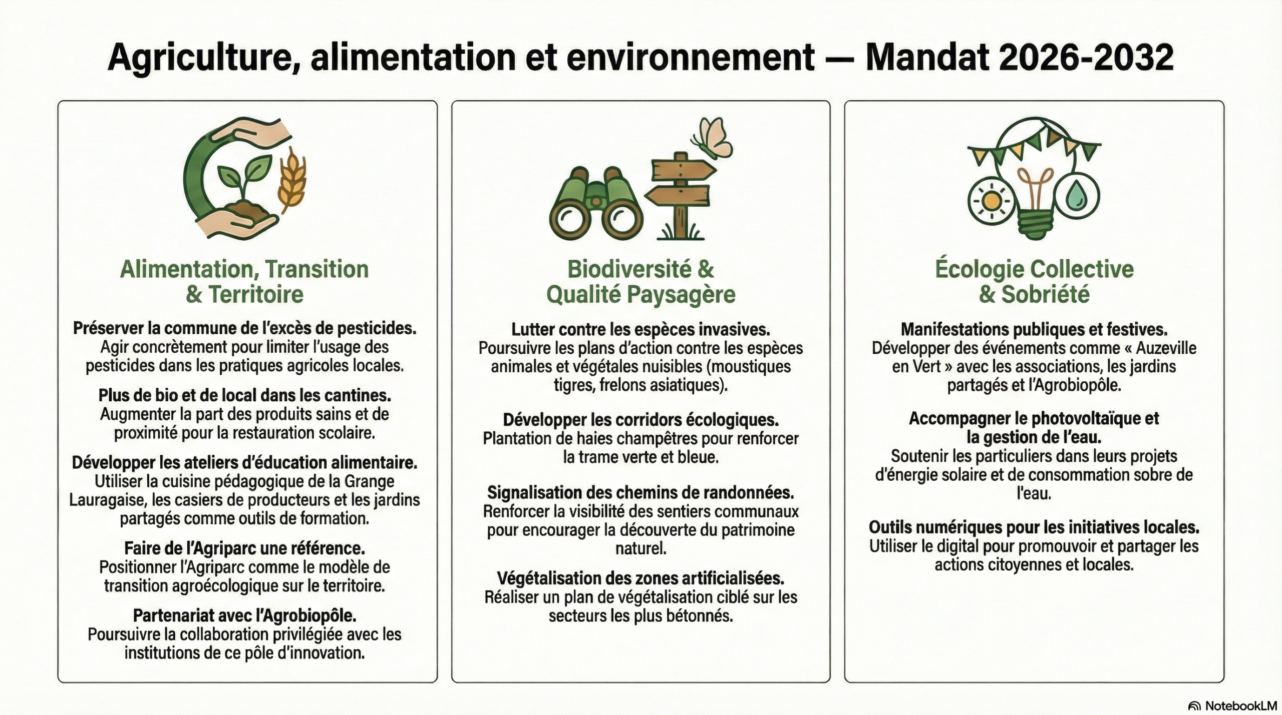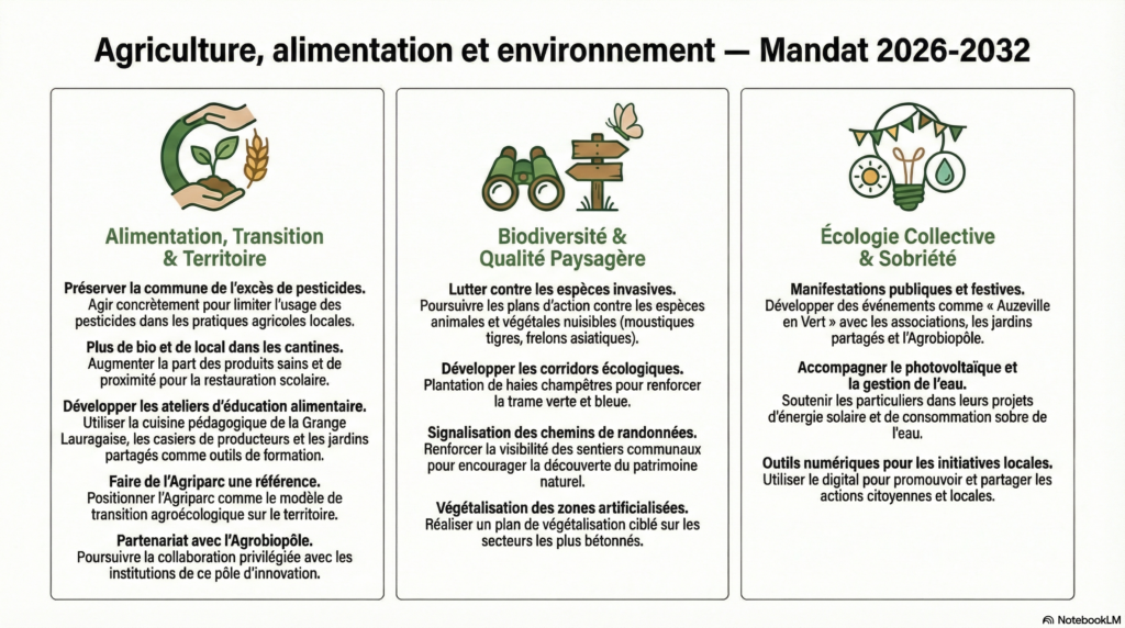 1) Nous ferons d’Auzeville un territoire où pouvoir manger local et bio soit accessible à tous. Nous agirons pour préserver notre commune de l’excès de pesticides dans les pratiques agricoles.