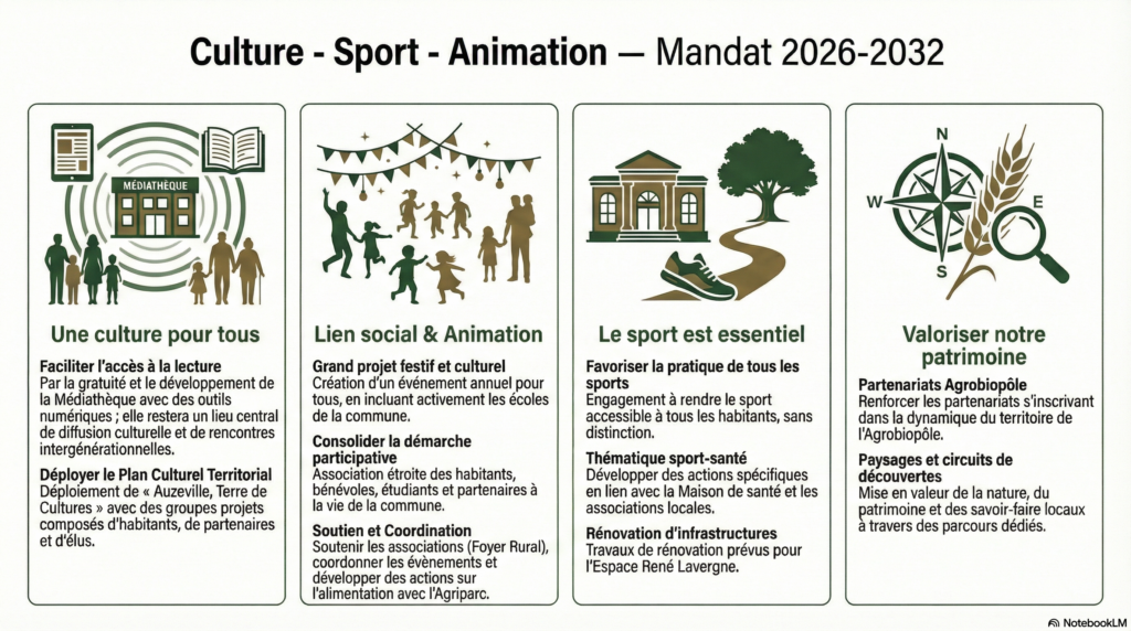 Nous croyons que la culture, le sport et l’animation sont des biens communs, moteurs de rencontres, de transmission et de bien-être. Nous voulons qu’ils restent accessibles à tous, à tout âge, au service d’un village solidaire, dynamique et vivant.