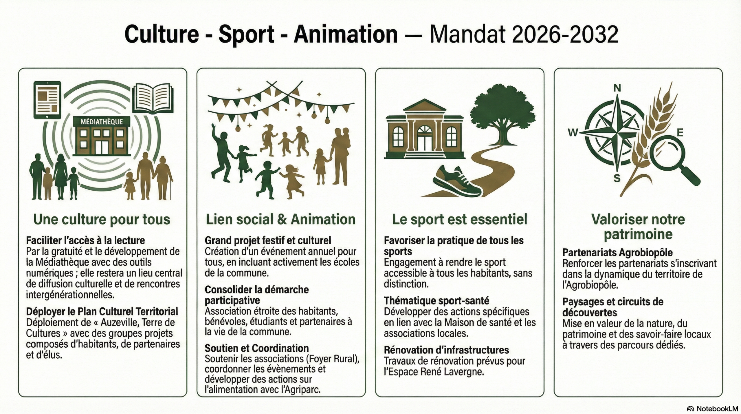- Déployer le Plan Culturel Territorial « Auzeville, Terre de Cultures » qui prévoit déjà dans sa charte des groupes projets réunissant des partenaires associatifs, et institutionnels, des habitants volontaires et conviés au tirage au sort, des représentants de la mairie.
