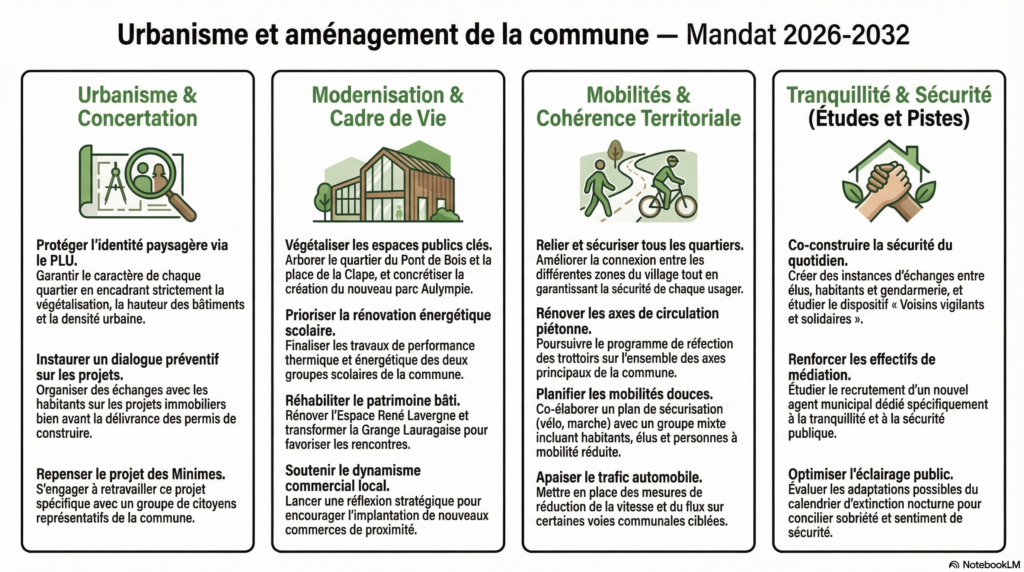 Nous voulons impulser une dynamique de village plus sobre, solidaire et respectueuse de la planète et des quartiers animés, favorisant la rencontre et le lien social. Convaincus que la participation citoyenne est essentielle, notre programme s’est construit et enrichi grâce à vos idées et aux trois temps de rencontres citoyennes :
